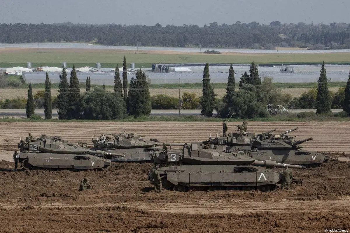 Tanques e veículos blindados israelenses implantados para a fronteira da Faixa de Gaza antes da marcha de aniversário da “Grande Marcha do Retorno”, em Sderot, Israel em 29 de março de 2019 [Faiz Abu Rmeleh / Agência Anadolu]
