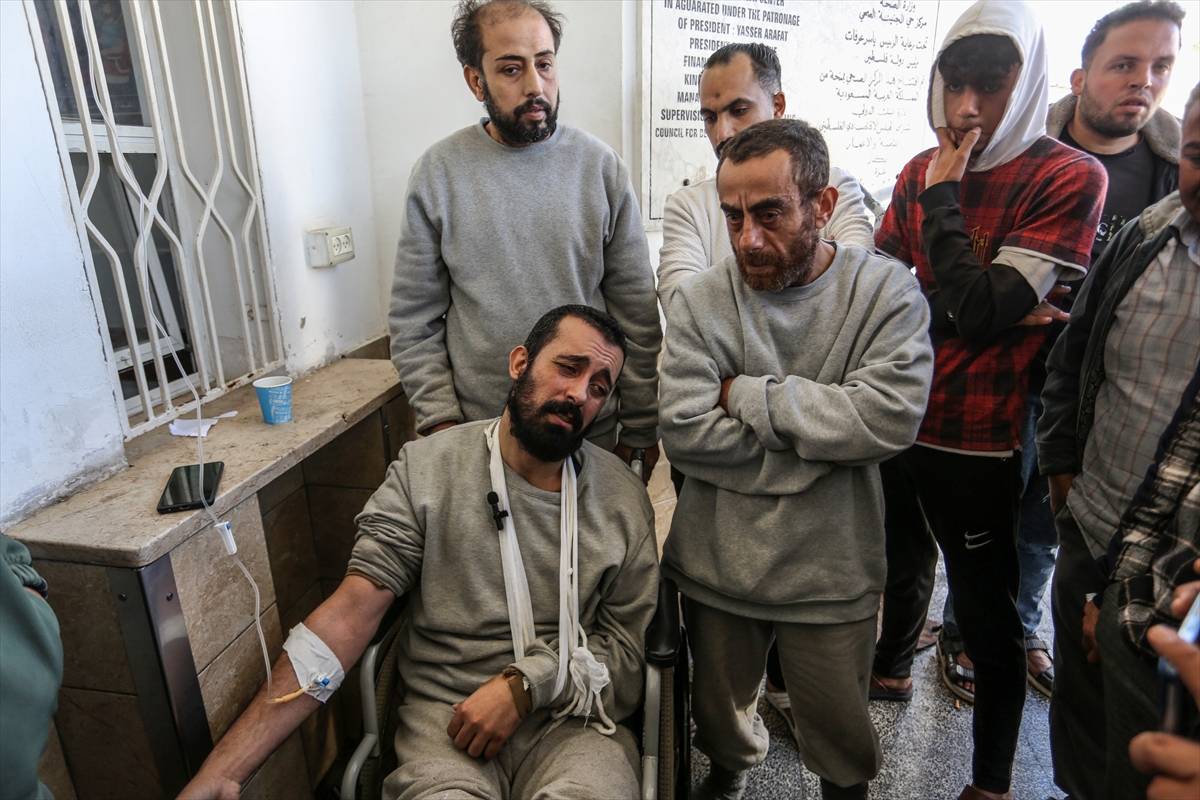 Palestinos presos por soldados israelenses, após dias sofrendo torturas físicas e psicológicas, foram libertados e levados direto ao Hospital Abu Yusuf al-Najjar com graves ferimentos em 19 de janeiro de 2024, na cidade de Rafat, Gaza. [Abed Rahim Khatib/Agência Anadolu]