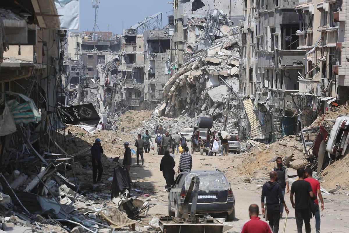 Destruição em Khan Yunis, após ataques israelenses, na Faixa de Gaza sitiada, em 8 de abril de 2024 [Ahmed Zaqout/Agência Anadolu]
