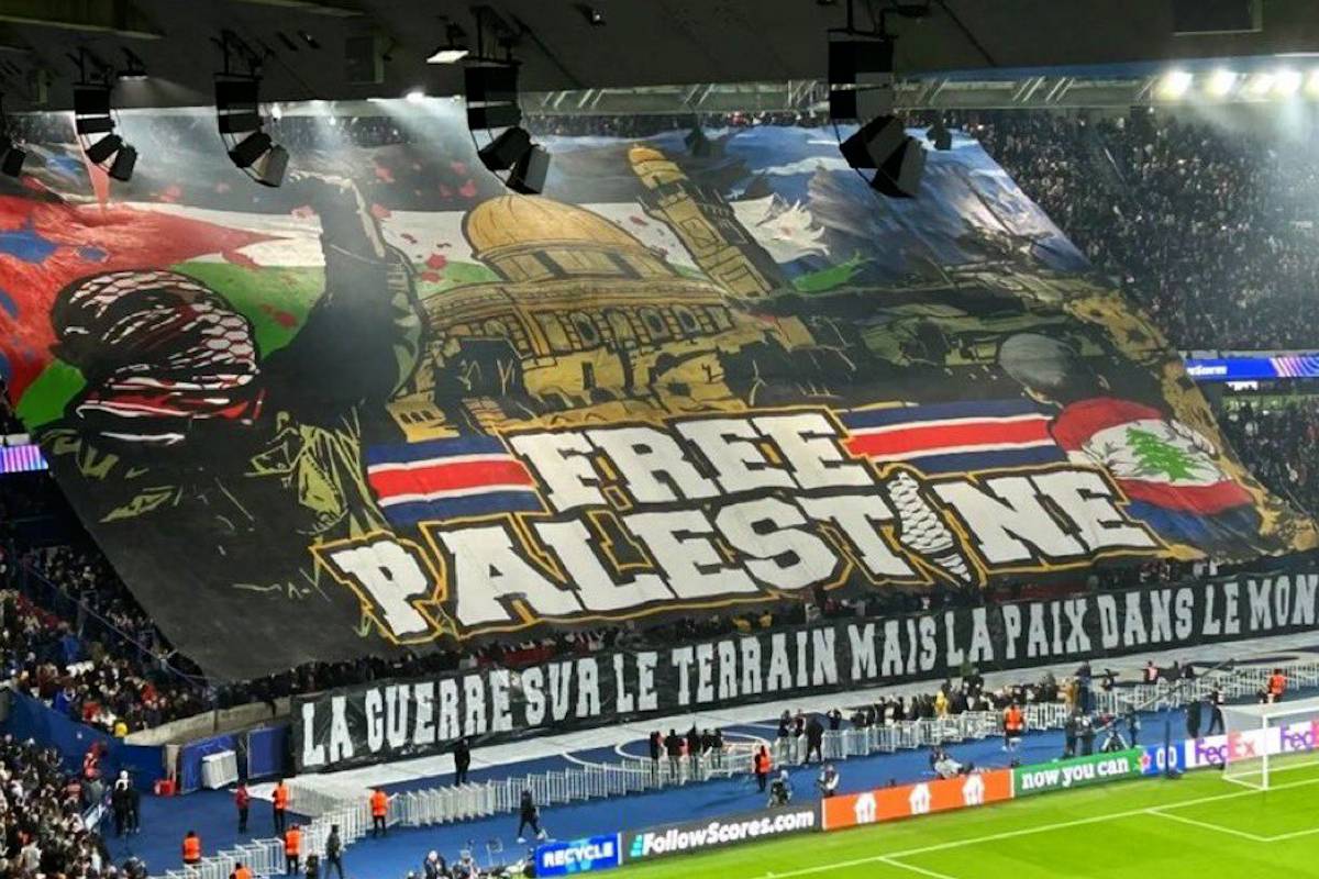 Torcida do clube francês Paris Saint-Germain (PSG) estende bandeira pró-Palestina nas arquibancadas do Parc des Princes, em partida da Liga dos Campeões da UEFA contra o Atlético de Madrid, em Paris, 6 de novembro de 2024 [Ibrahim Ezzat/Agência Anadolu]
