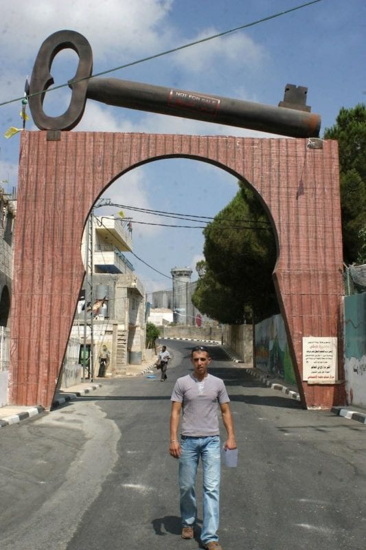 Um palestino caminha sob a chave simbólica,representada em um marco do 60º aniversário da Nakba (Dia da Catástrofe) palestina, no campo de refugiados de Aida, perto da cidade de Belém, na Cisjordânia, em 6 de julho de 2009. [Najeh Hashlamoun]