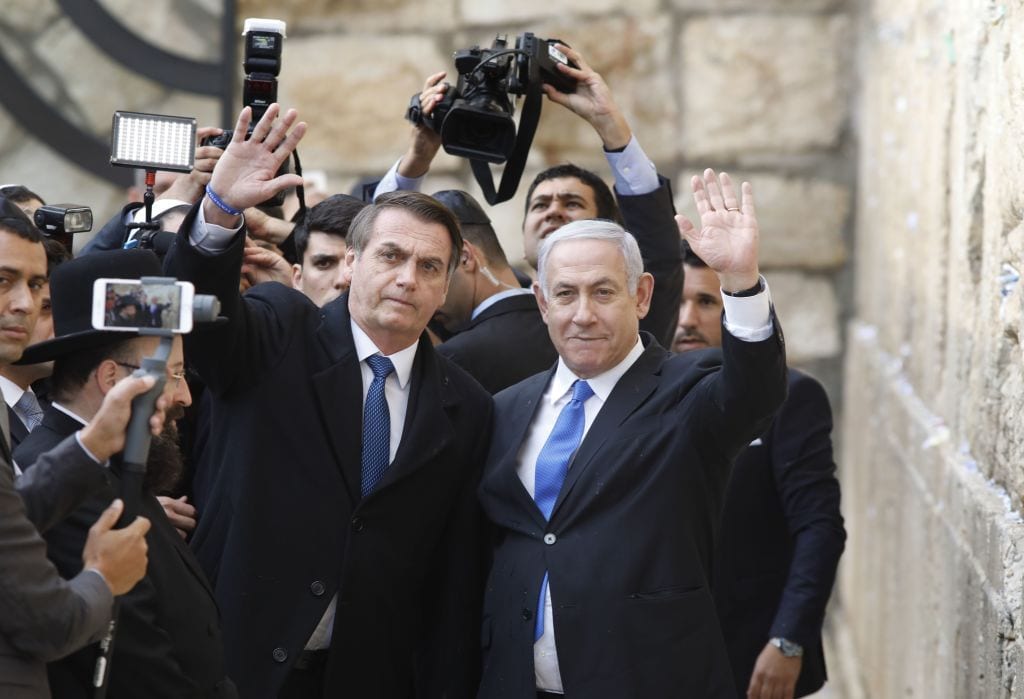 O presidente brasileiro Jair Bolsonaro (E) e o primeiro-ministro israelense Benjamin Netanyahu acenam para a imprensa durante uma visita ao muro ocidental, o local de oração mais sagrado para os judeus, na Cidade Velha de Jerusalém, em 1º de abril de 2019 [Menahem Kahana/AFP/Getty Images]
