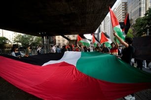 Comunidade árabe e palestina se reúne na Avenida Paulista, em São Paulo, para protestar contra o chamado plano de paz do presidente dos EUA, Donald Trump