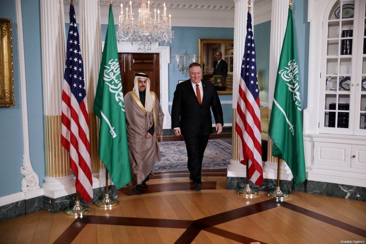 Ministro de Relações Exteriores da Arábia Saudita Faisal bin Farhan Al Saud e Secretário de Estado dos Estados Unidos Mike Pompeo reúnem-se no escritório do Departamento de Estado americano, em Washington DC, 12 de fevereiro de 2020 [Yasin Öztürk/Agência Anadolu]