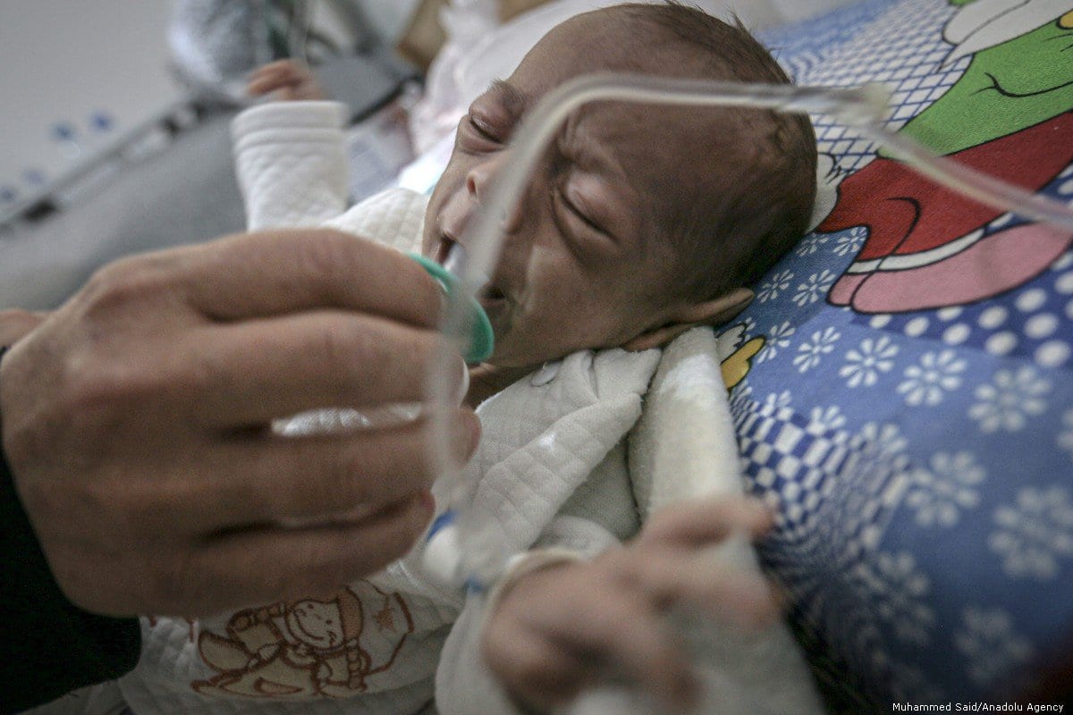Bebê sírio malnutrido recebe tratamento em um hospital de Idlib, província da Síria, em 5 de outubro de 2019 [Muhammed Said/Agência Anadolu]