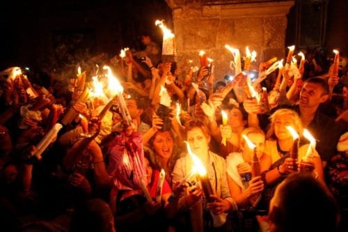 A cerimônia do Fogo Sagrado atrai tipicamente dezenas de milhares de fiéis a um imponente edículo cinza no Santo Sepulcro, que se acredita conter a tumba onde Jesus jazia dois mil anos atrás.