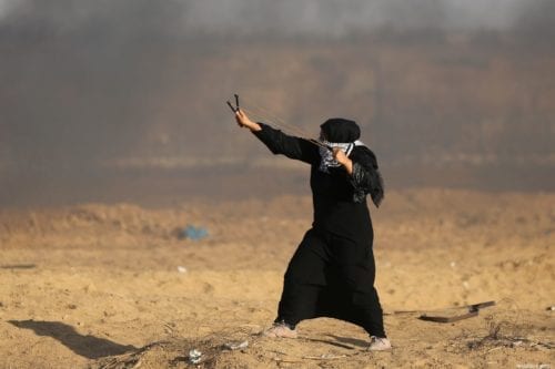 Palestinos jogam pedras com o uso de estilingues nas forças israelenses durante uma manifestação na “Grande Marcha do Retorno” na fronteira Israel-Gaza, no leste de Gaza, em 27 de setembro de 2019. [Ashraf Amra/Agência Anadolu]