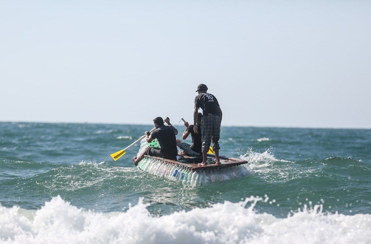 Pescador palestino Abu Zaid navega em seu barco manufaturado com cerca de 700 garrafas plásticas, na costa da Cidade de Gaza [Mustafa Hassona/Agência Anadolu]