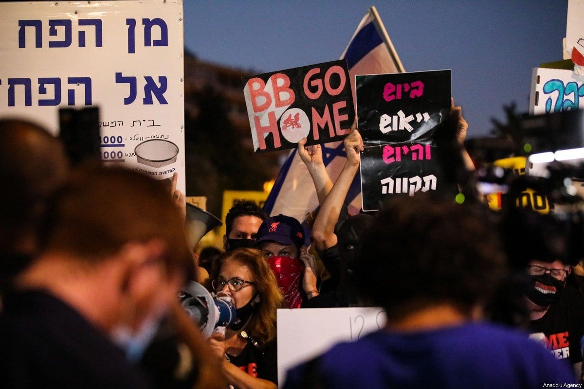 Os manifestantes entoaram palavras de ordem contra Netanyahu e exibiram cartazes reivindicando sua renúncia, diante de acusações graves de corrupção e má gestão da crise do coronavírus, o que afetou negativamente a economia do país.