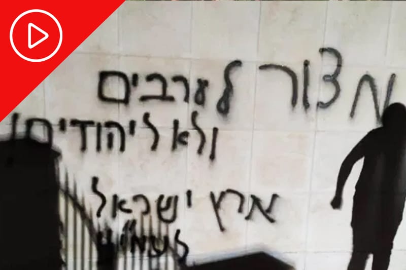 As fotos da cena mostravam paredes carbonizadas com pichações que diziam: “Cerco aos árabes, não aos judeus” e “a Terra de Israel para o povo de Israel”.