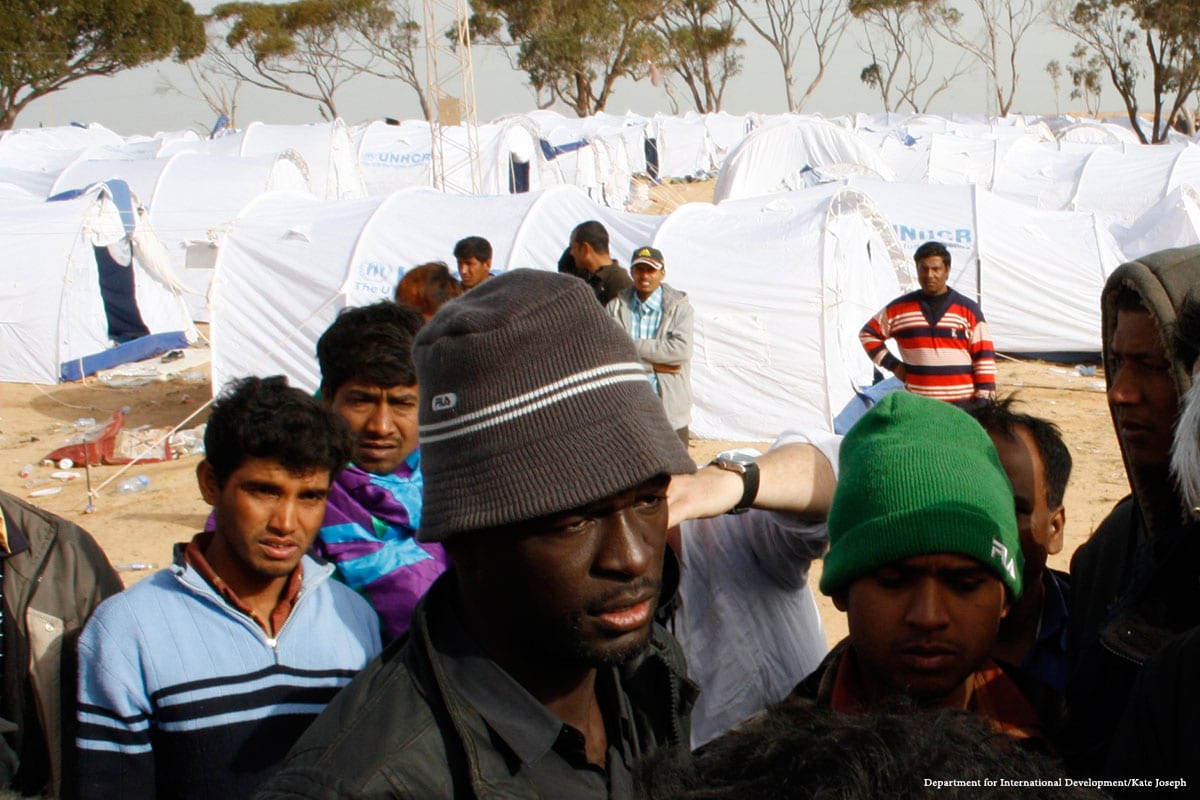 Refugiados em abrigos provisórios na Líbia [Departamento de Desenvolvimento Internacional/Kate Joseph]