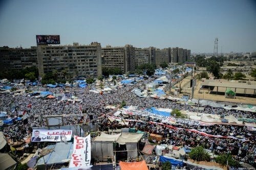 Vista aérea da Praça de Rabaa al-Adawiyya, onde dezenas de milhares de manifestantes protestavam contra o golpe militar que depôs o Presidente do Egito Mohamed Morsi, no Cairo, capital do Egito, 26 de julho de 2013 [Mohammed Elshamy/Agência Anadolu]