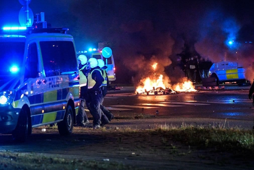 ![Policiais isolam a área onde pneus foram queimados e fogos de artifício foram disparados durante protestos da extrema-direita no bairro de Rosengard, na cidade de Malmo, Suécia, 28 de agosto de 2020 [TT News Agency/AFP/Getty Images]](https://www.monitordooriente.com/wp-content/uploads/2020/08/GettyImages-1228243022-e1598787508350.jpg)