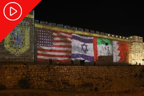 Durante a cerimônia de assinatura do chamado Acordo de Abraão, na Casa Branca, Israel projetou bandeiras dos quatro países envolvidos nos muros da Cidade Velha de Jerusalém.