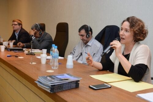 Prof. Arlene Clemesha, Nur Masalha, Dr. Daud Abdullah e Ben White no seminário realizado pelo Monitor do Oriente na USP, Dezembro de 2016 [Foto Lina Bakr]