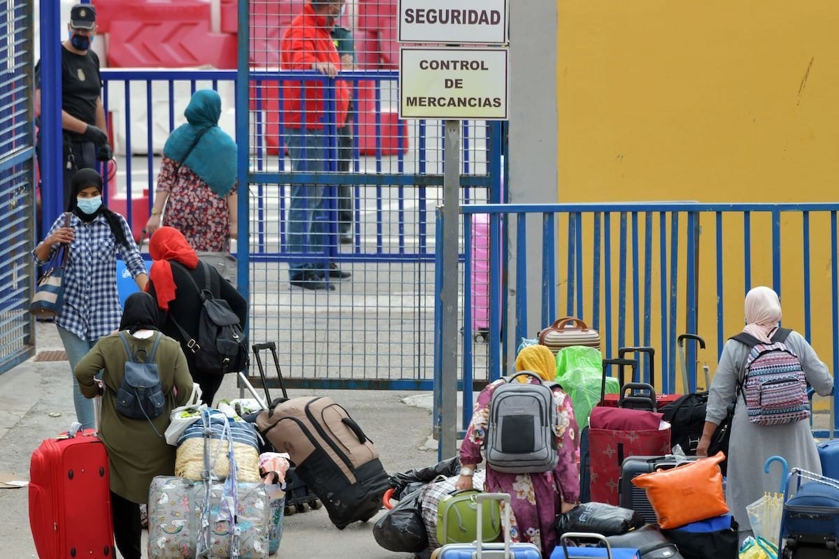 Cidadãos marroquinos presos na Espanha desde o fechamento das fronteiras em meados de marços, diante da pandemia de coronavírus, seguem ao setor alfandegário antes de atravessar a fronteira com o Marrocos, no território espanhol de Ceuta, em 30 de setembro de 2020 [Antonio Sempere/AFP/Getty Images]