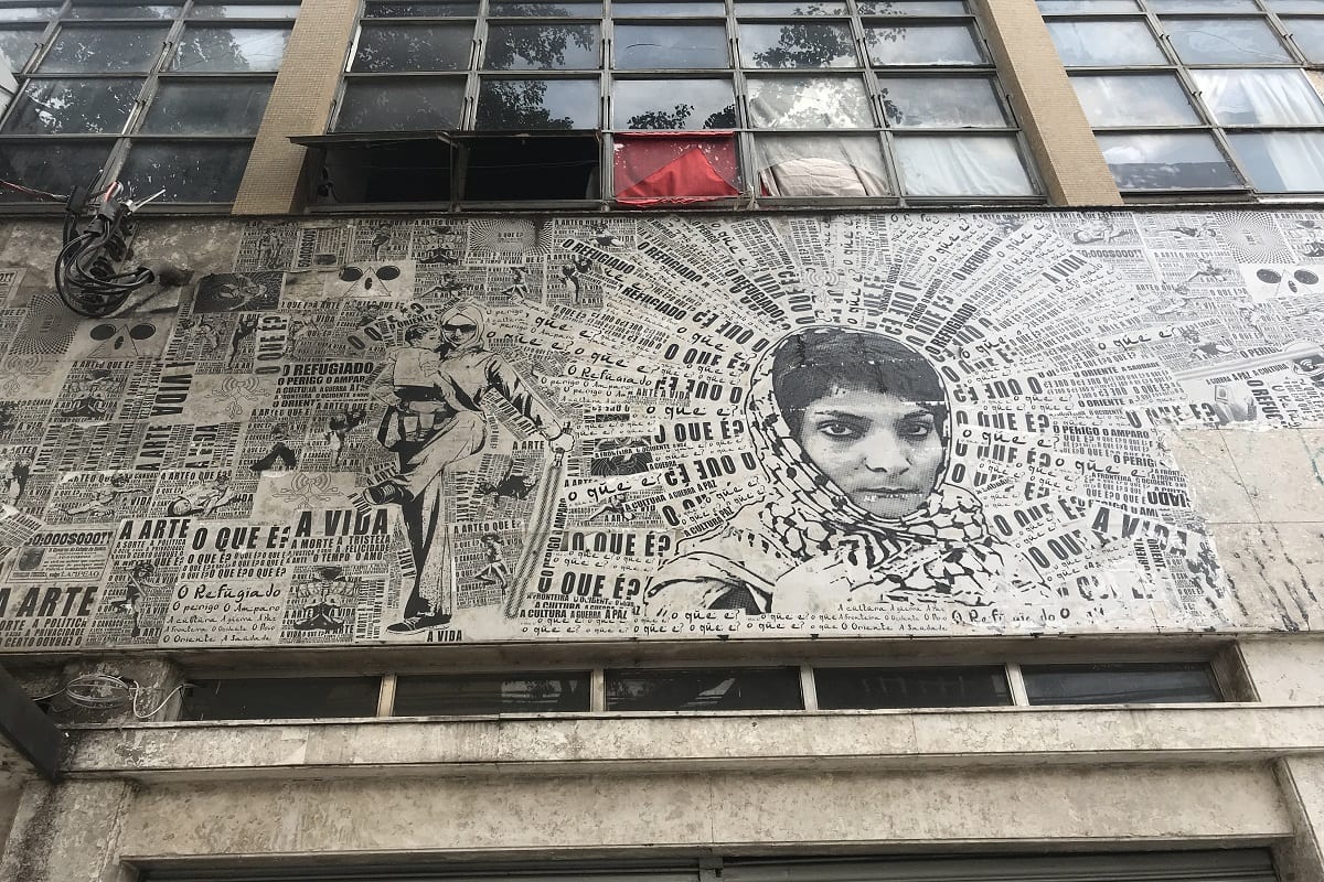 Quando vi essa cena, eu e meu amigo que me acompanhava quisemos examinar cada detalhe do lugar! Também ficamos surpresos com uma imagem de “Handala palestino” pintada nas portas de uma loja abaixo do mesmo prédio, e para quem não conhece Handala, é uma assinatura do cartunista palestino Naji Al-Ali, e tornou-se com o tempo um símbolo da identidade palestina! A cena de Handala com Leila Khaled despertou nossa curiosidade em perguntar na vizinhança sobre o prédio e quem mora nele! A partir daqui a história começa … a história de um prédio que é quase um acampamento palestino!Este edifício é composto por mais de 20 andares, propriedade de um banco brasileiro, mas não tem escritórios, e várias famílias o ocuparam e moraram ilegalmente por quase 6 anos, Dividiram os pátios dos andares em cômodos usando painéis de madeira que não os isola completa e suficientemente. A situação continua a mesma desde então, pois a lei não permite que eles saiam do prédio contra sua vontade. Foi o que nos disse a administração do prédio formado por 3 pessoas que pertencem ao famoso grupo movimento Terra Livre no Brasil, que se tornou responsável pelos moradores da arquitetura e os defendeu perante o judiciário brasileiro.