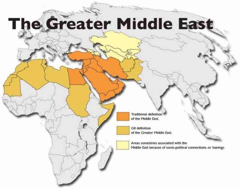 Grande Oriente Médio: Em laranja escuro, a definição tradicional de Oriente Médio. Em laranja amarelado, a definição de Grande Oriente Médio dada pelo G8. Em amarelo claro, região às vezes considerada parte do Oriente Médio devido a conexões ou aproximações socio-políticas.
