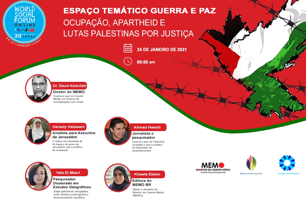 Todos os anos, o espaço sempre recebe diversas atividades voltadas à discutir e dar visibilidade à causa palestina.  Nesta edição, o site Monitor do Oriente Médio organiza o painel “Ocupação, Apartheid e Lutas Palestinas por Justiça”, que acontecerá dia 24 de janeiro, às 9h da manhã (horário de Brasilia). O webinar está inscrito dentro dos espaços temáticos “Guerra e Paz” e “Comunicação, Educação e Cultura” do FMS.