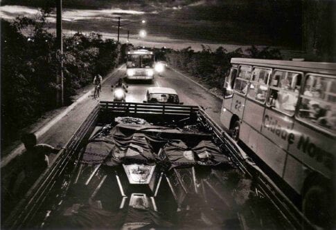 Bandeiras do MST cobrem os caixões dos trabalhadores mortos no massacre de Eldorado dos Carajás [Sebastião Salgado/ Armazém Memória]