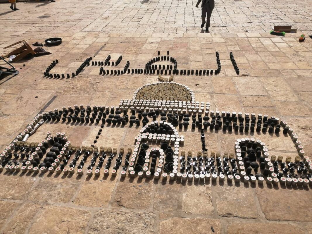 Os palestinos na segunda-feira à noite (10 de maio) fizeram a silhueta do Domo da Rocha usando balas de plástico atiradas pela polícia israelense e restos de granadas atordoantes no complexo Al-Aqsa em Jerusalém Oriental. Eles também escreveram “Jerusalém” em árabe.