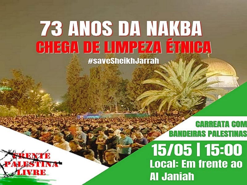 No dia 15 de maio, data que marca o 73º aniversário da Nakba, a comunidade palestina brasileira organiza uma carreata em solidariedade aos palestinos que resistem aos ataques israelenses em Jerusalém. A manifestação “73 anos da Nakba: chega de limpeza étnica” terá início às 15 horas, no sábado, em frente ao restaurante Al Janiah, e seguirá pela avenida Paulista até o Pacaembu. Os organizadores pedem que bandeiras palestinas sejam colocadas nos carros ou cartazes em solidariedade à Sheikh Jarrah, apoio à resistência em Jerusalém e pelo fim da Nakba. O ponto de encontro é a Rua Rui Barbosa, 269.
