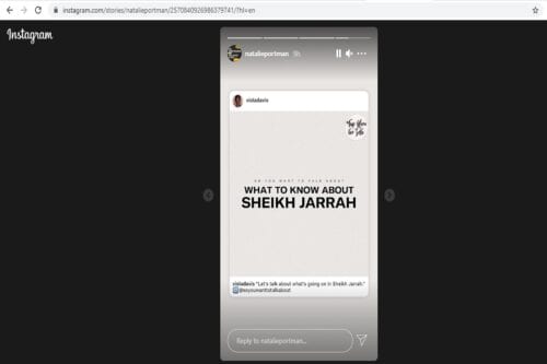 A atriz israelense-americana Natalie Portman compartilhou em sua página no Instagram, um post publicado pela atriz americana Viola Davis, o prêmio da Academia, explicando em detalhes a situação do bairro Sheikh Jarrah desde que os moradores foram instalados lá em 1956 sob um acordo entre a UNRWA e o governo jordaniano, até as ameaças que enfrentam nas últimas semana. As famílias estão sendo expulsas de suas casas para alojar colonos .A postagem do instagram mostra simpatia clara pelos moradores e a posição em apoio à sua causa. rejeitando a política racista de ocupação no trato com as pessoas do bairro.
