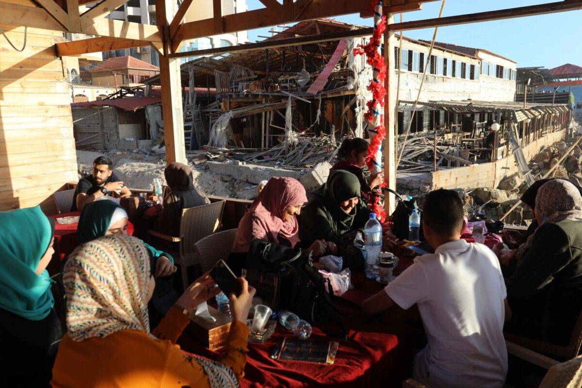 Os palestinos são vistos em um restaurante que foi parcialmente destruído após os ataques israelenses, na costa da cidade de Gaza, Gaza, em 23 de maio de 2021 [Ashraf Amra]