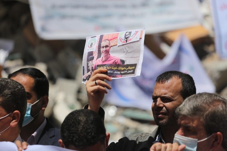 Fórum de Mídia de Gaza protesta em frente à Torre al-Jawhara, para denunciar ataques israelenses contra a imprensa, em 27 de maio de 2021 [Mohammed Asad/Monitor do Oriente Médio]