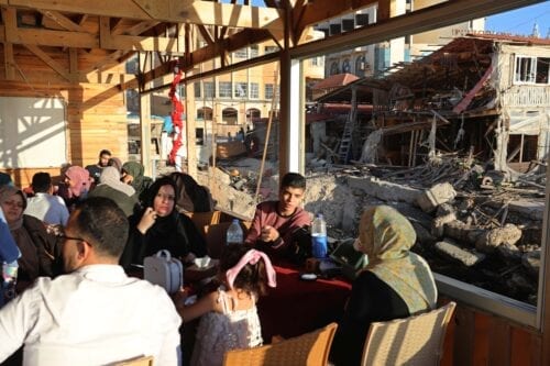 Os palestinos são vistos em um restaurante que foi parcialmente destruído após os ataques israelenses, na costa da cidade de Gaza, Gaza, em 23 de maio de 2021 [Ashraf Amra]