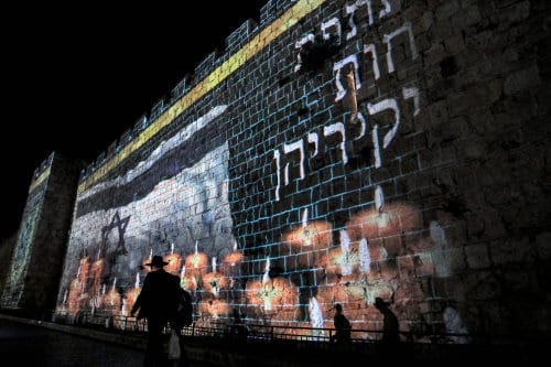 Projeção da bandeira israelense nos Muros da Cidade Velha de Jerusalém ocupada; Israel declara dia nacional de luto pelas vítimas do tumulto no Monte Meron, em 2 de maio de 2021 [Ahmad Gharabli/AFP via Getty Images]