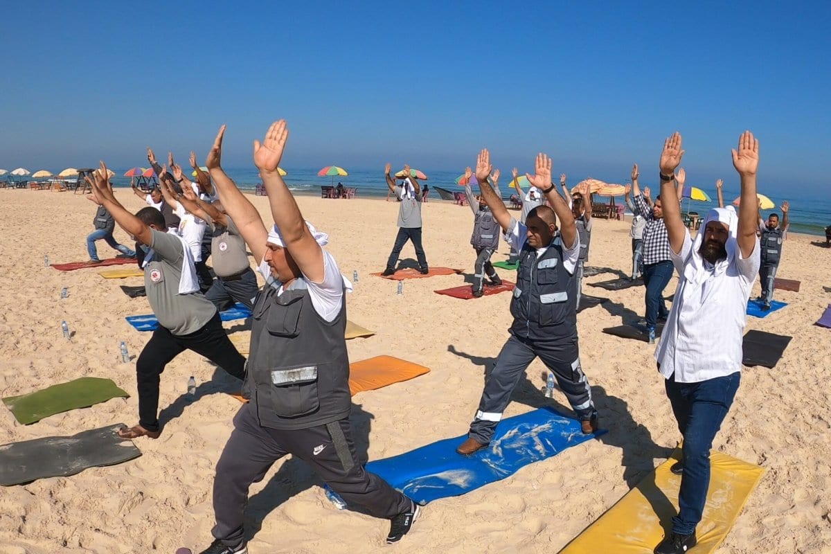 Uma aula de ioga foi realizada na praia de Gaza para ajudar os paramédicos a lidarem com parte do trauma que sofreram durante a última campanha de bombardeio de Israel, que terminou em 21 de maio.