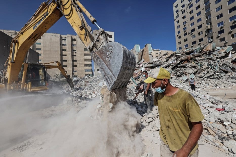 Trabalhadores palestinos coletam os escombros da torre Al-Jalaa na Cidade de Gaza em 22 de junho de 2021 [Mohammed Abed/AFP via Getty Images]