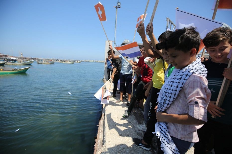 Diversas bandeiras foram exibidas no evento — incluindo França, Iraque, Marrocos, Espanha, Reino Unido, China, entre outras —; algumas crianças também fixaram suas mensagens em balões para sobrevoar os mares de Gaza.