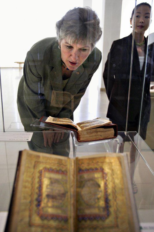 Karen Hughes, subsecretária de estado dos EUA para diplomacia pública, dá uma olhada em um Alcorão em exibição no Museu de Arte Islâmica em Kuala Lumpur, 23 de outubro de 2005 [Tengku Bahar/AFP via Getty Images]