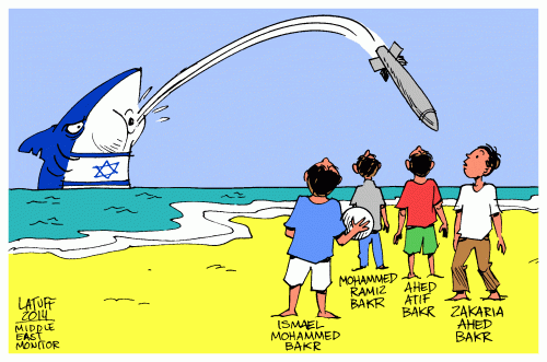4 crianças morreram na praia em Gaza por projéteis disparados de um navio de guerra israelense – Cartoon [Latuff / Monitor do Oriente Médio]