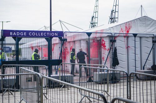 Ativistas da Ação Palestina escalaram as cercas do centro de exposições Excel em Londres, tenda de segurança com sangue tingido de vermelho e lançaram sinalizadores vermelhos e verdes no domingo, 12 de setembro de 2021 [VX Photo / Vudi Xhymshiti]