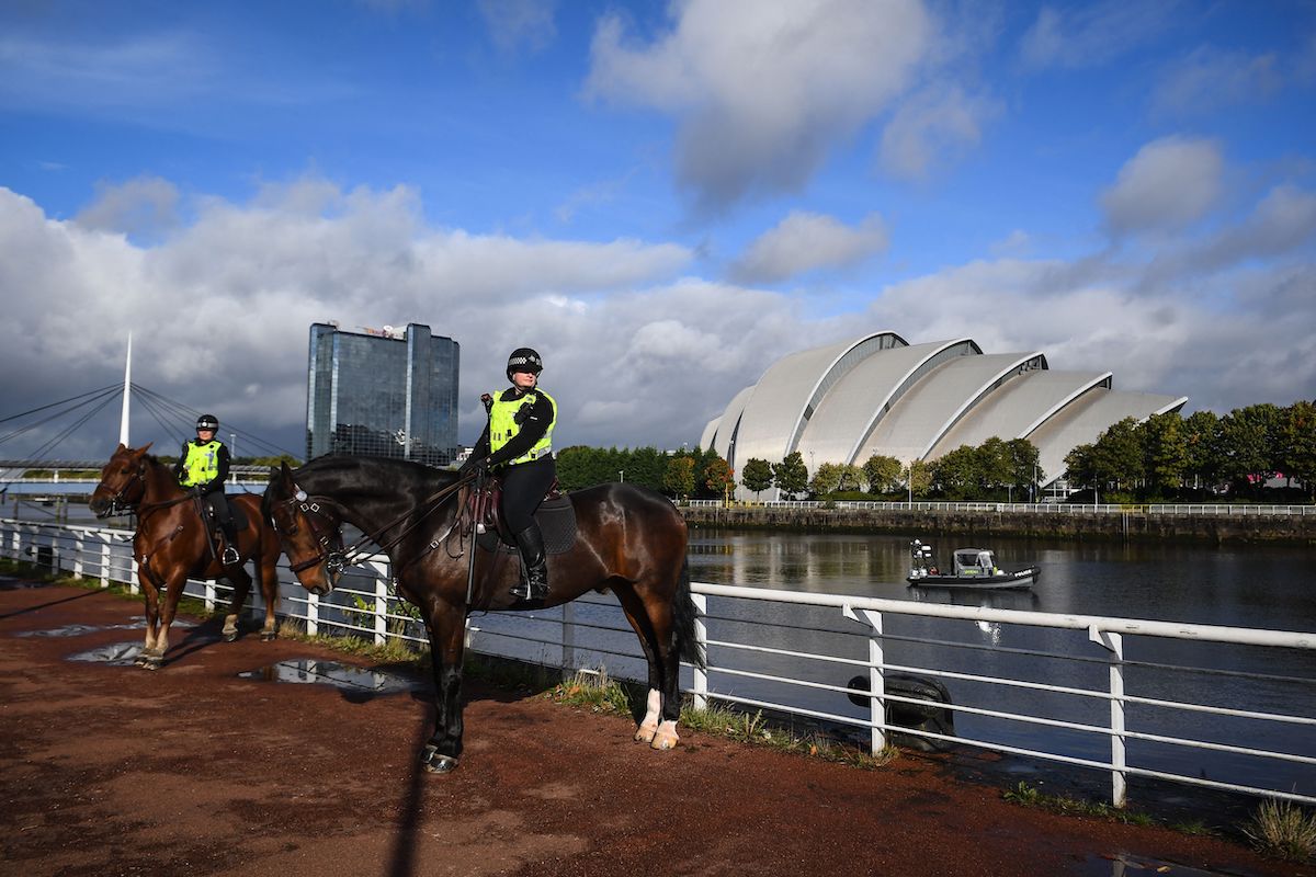 A polícia escocesa monta uma patrulha de oficiais perto do local da SSE Hydro, em Glasgow, em 4 de outubro de 2021, enquanto a cidade se prepara para sediar a COP26 da Conferência das Nações Unidas sobre o Clima, em novembro. [ANDY BUCHANAN/AFP via Getty Images]