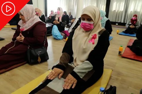 O Positive Energy Club (Clube de Energia Positiva) de Gaza organizou hoje uma sessão de ioga para pacientes com câncer, num esforço para ajudá-los a construir força e erradicar a energia negativa.