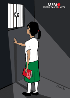 Tribunal militar israelense condenou Malak Al-Khatib, de 14 anos, a dois meses de prisão e multou-a em $1.528 – Charge [Sarwar Ahmed/Monitor do Oriente Médio]