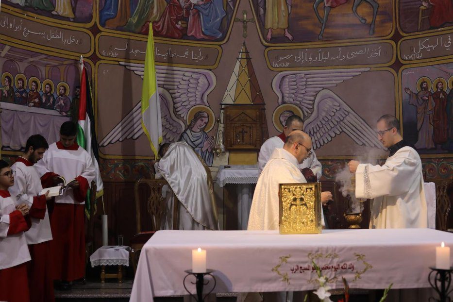 Cristãos palestinos oram na igreja Der Latin na véspera de Natal, em 24 de dezembro de 2021 [Mohammed Asad/Monitor do Oriente Médio]