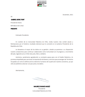 Carta da Comunidade Palestina no Chile ao presidente eleito Gabriel Boric [Comunidade Palestina no Chile/Facebook]
