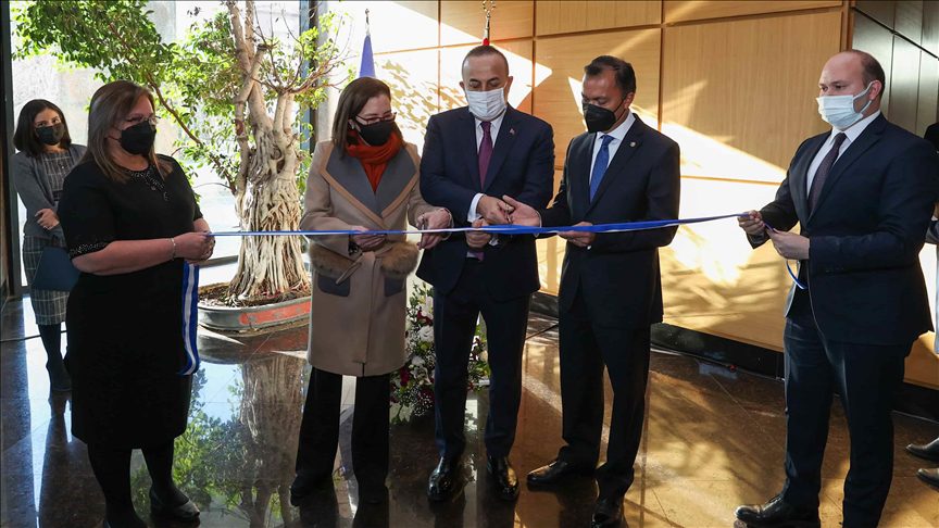 O ministros das Relações Exteriores da Turquia, Mevlut Cavusoglu (centro) e a ministra alvadorenha Alexandra Hill (3ª à esquerda) participam da cerimônia de abertura da Embaixada de El Salvador em Ancara, Turquia, em 20 de novembro de 2022. [Cem Özdel/Agência Anadolu]