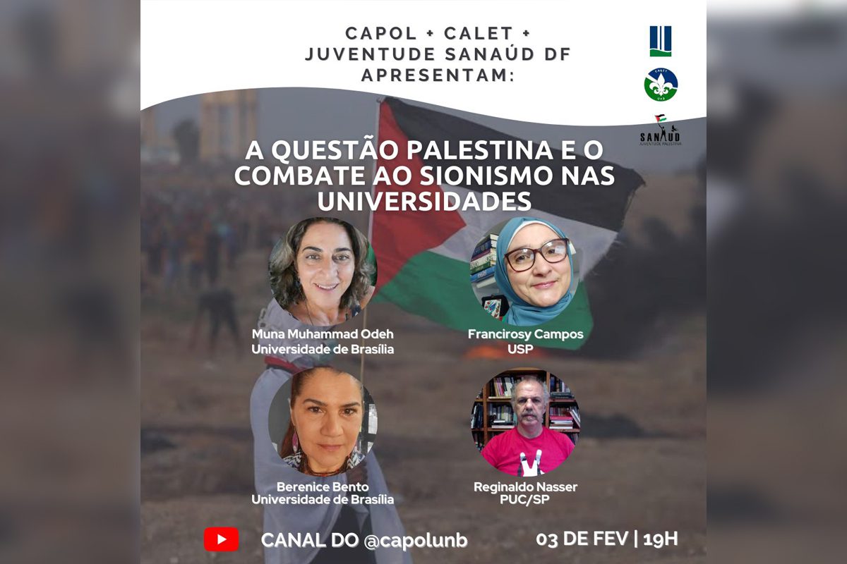 Os Centros Acadêmicos de Ciência Política e de Letras em pareceira com a Sanaúd DF realizam o evento “A Questão Palestina e o combate ao sionismo nas universidades”, que acontecerá 03 de fevereiro, às 19h. Com o intuito de introduzir o tema Palestina e discutir o combate à ideologia sionista, os palestrantes serão: as professoras Dra. Muna Muhammad Odeh (UnB), Dra. Berenice Bento (UnB), Dra. Francirosy Campos (USP), e o professor Dr. Reginaldo Nasser (PUC/SP) para uma conversa.