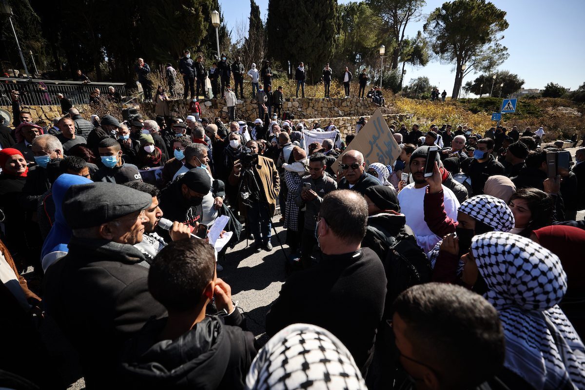 Protesto palestino em frente ao escritório do premiê israelense Naftali Bennett, contra ataques da ocupação contra os residentes do Negev, em Jerusalém ocupada, 30 de janeiro de 2022 [Mostafa Alkharouf/Agência Anadolu]