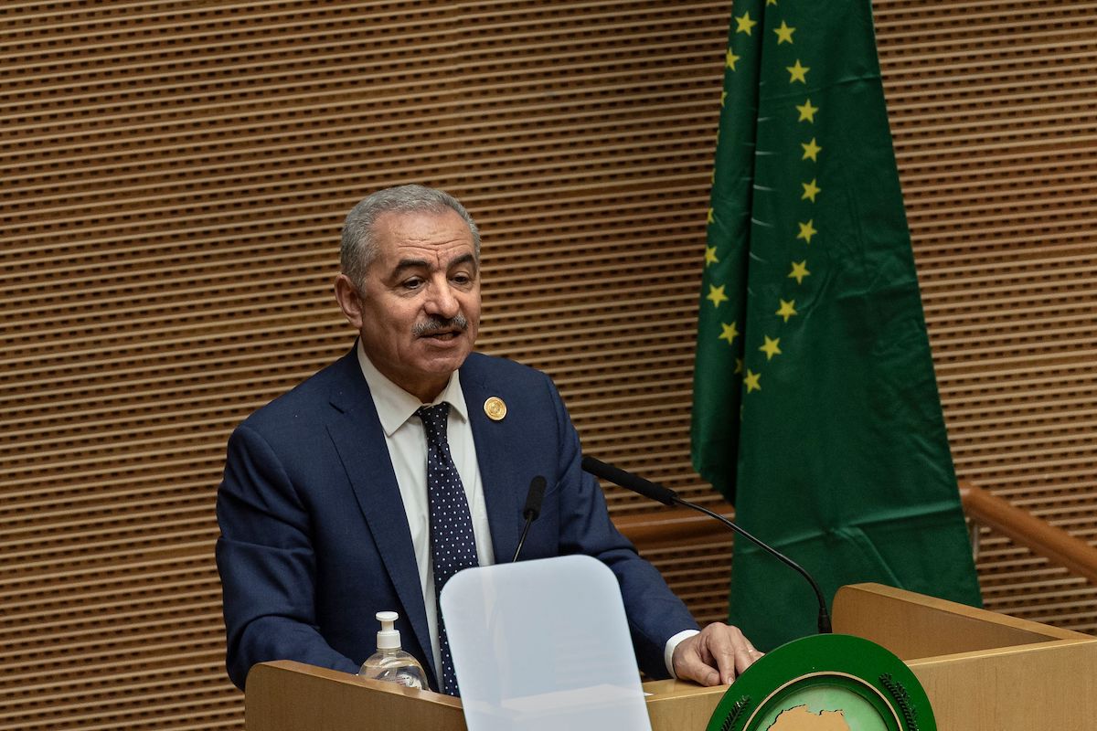 O primeiro-ministro palestino, Mohammad Shtayyeh, discursa na 35ª Sessão Ordinária da Cúpula da União Africana (UA) em Adis Abeba, Etiópia, em 5 de fevereiro de 2022. [Tony Karumba/AFP via Getty Images]