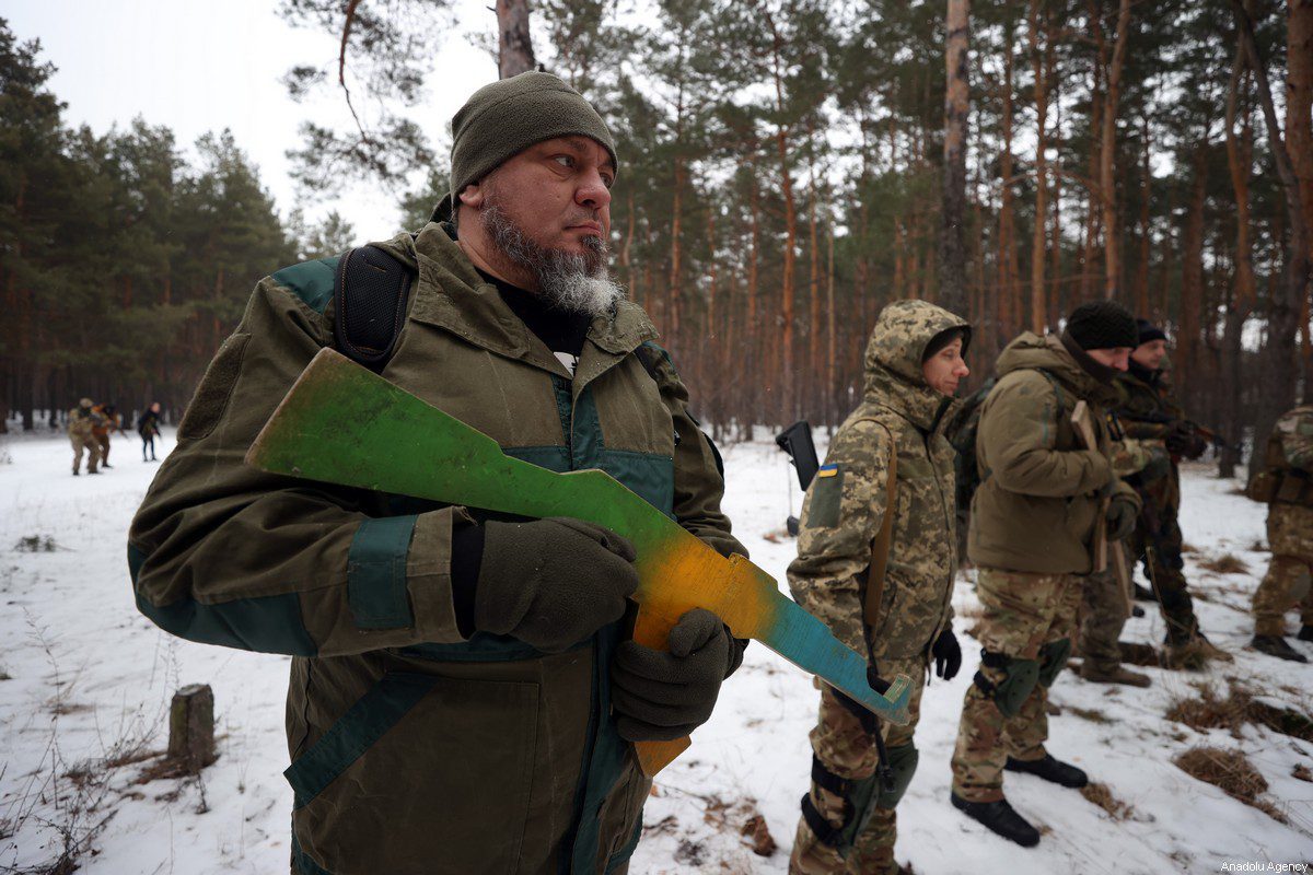 Membros das forças de reserva do exército ucraniano treinam civis em métodos de defesa regional em resposta às circunstâncias do conflito em Kiev, Ucrânia, em 5 de fevereiro de 2022 [Ali Atmaca / Agência Anadolu]