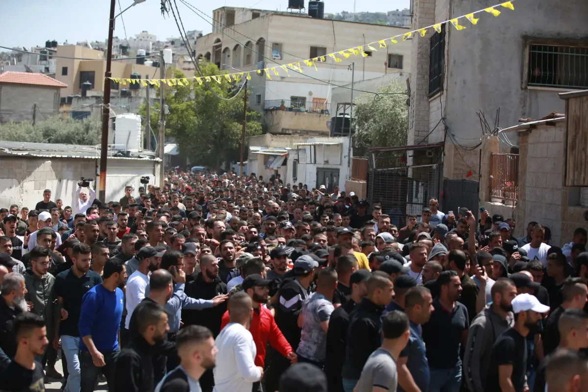 Palestinos assistem à cerimônia fúnebre do palestino Ahmed Nasser Al-Saidi, que foi morto no ataque das forças israelenses, no campo de refugiados de Jenin em Jenin, Cisjordânia, em 9 de abril de 2022. [Issam Rimawi – Agência Anadolu]