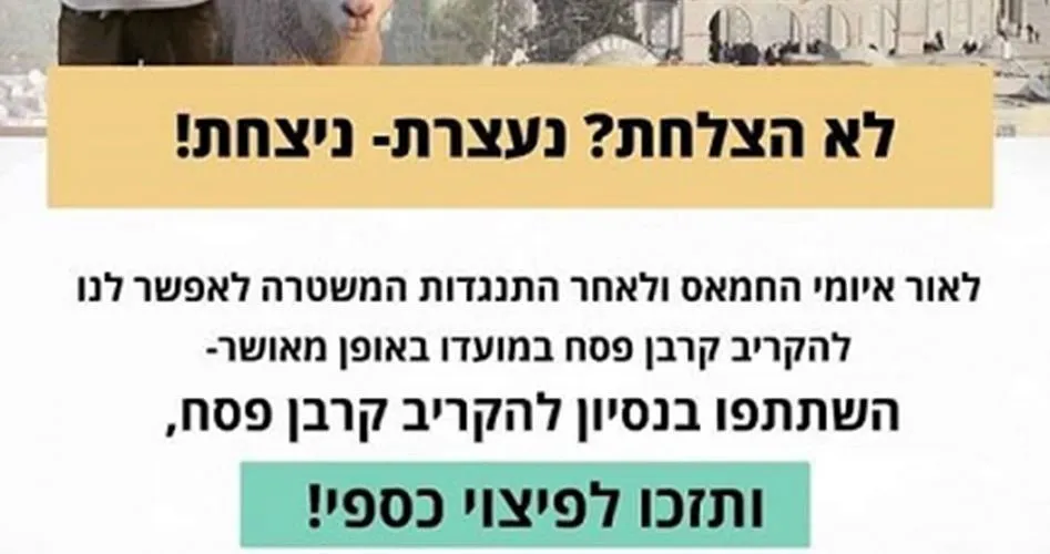 Um anúncio em hebraico convidando as pessoas a se juntarem ao Sacrifício da Páscoa no terceiro local mais sagrado do Islã, a Mesquita de Al-Aqsa, e ganharem uma compensação monetária. Ele lê: “Você não conseguiu? Você foi preso – você ganhou!” “À luz das ameaças do Hamas e da objeção da polícia para que façamos o sacrifício da Páscoa em seu devido tempo de maneira aprovada – junte-se às tentativas de fazer o sacrifício da Páscoa e receba uma recompensa financeira!”