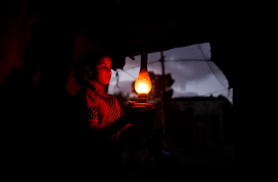 Uma menina palestina usa uma lâmpada a gás durante um corte de energia em Gaza em 18 de agosto de 2020 [Mahmud Hams/AFP via Getty Images]